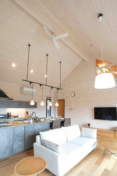 室内は天井の高いリビングダイニングルーム、モダンなキッチンやマリメッコ、イッタラなどの北欧食器、2つの独立した寝室とロフト、広々したパウダールームとバスルーム、屋根付きウッドデッキを備えており、ご家族やご友人と滞在や女子旅などのご利用時でもゆったりと快適にお過ごしいただけます。また、ドラム式洗濯乾燥機、薪ストーブ、BBQグリル、Bluetoothオーディオ、高速WifiやNetflix視聴可能な大型TVなど、設備面も充実していますので、テレワーク、ワーケーションや長期滞在でもご不便なくご利用いただけます。