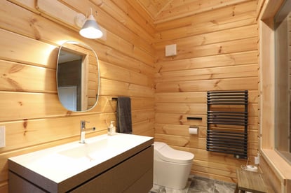 家全体が無垢の木で作られており、室内に入ると北欧パインの清涼感のある木の香りに包まれ、心身ともに癒されます。分厚いログ材が天然の断熱材となっており、化学物質が使われていないため小さなお子様やアレルギーをお持ちの方にも安心してご滞在いただけます。