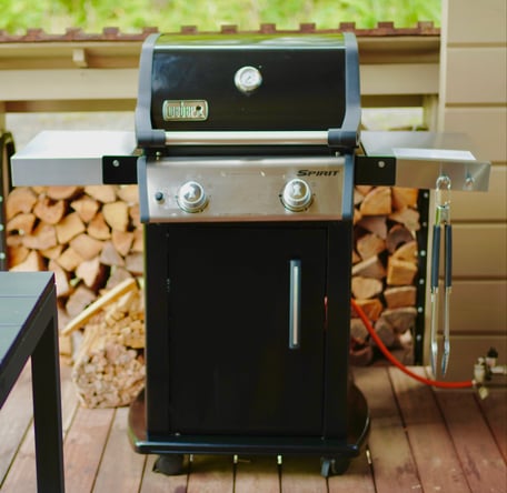 The wood deck is covered with a roof and equipped with a dining set and a gas BBQ grill, allowing you to enjoy meals outdoors.